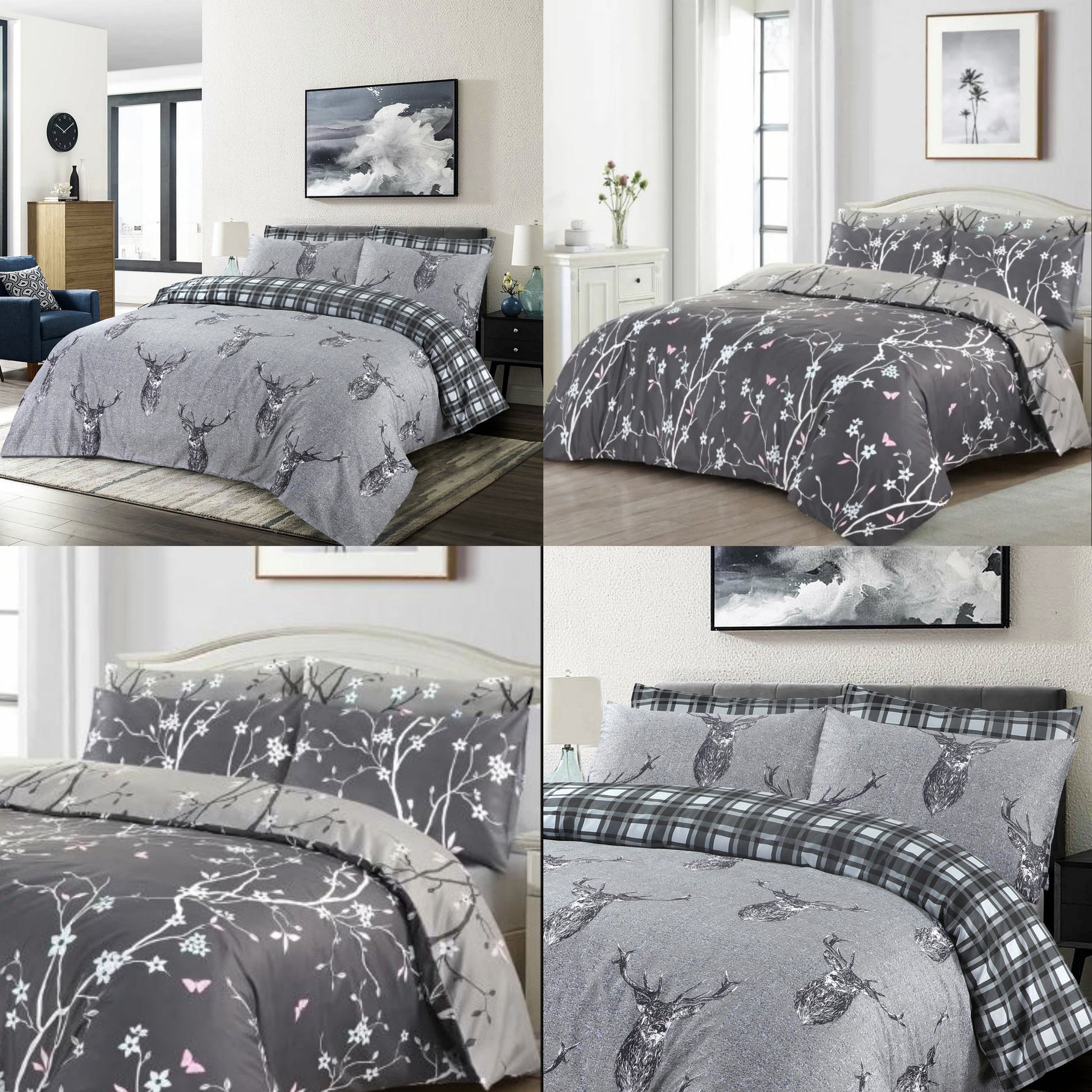 Printed Duvet Cover Grey Bedding Set with Pillowcases Reversible Double King Super King UK Size Quilt Covers